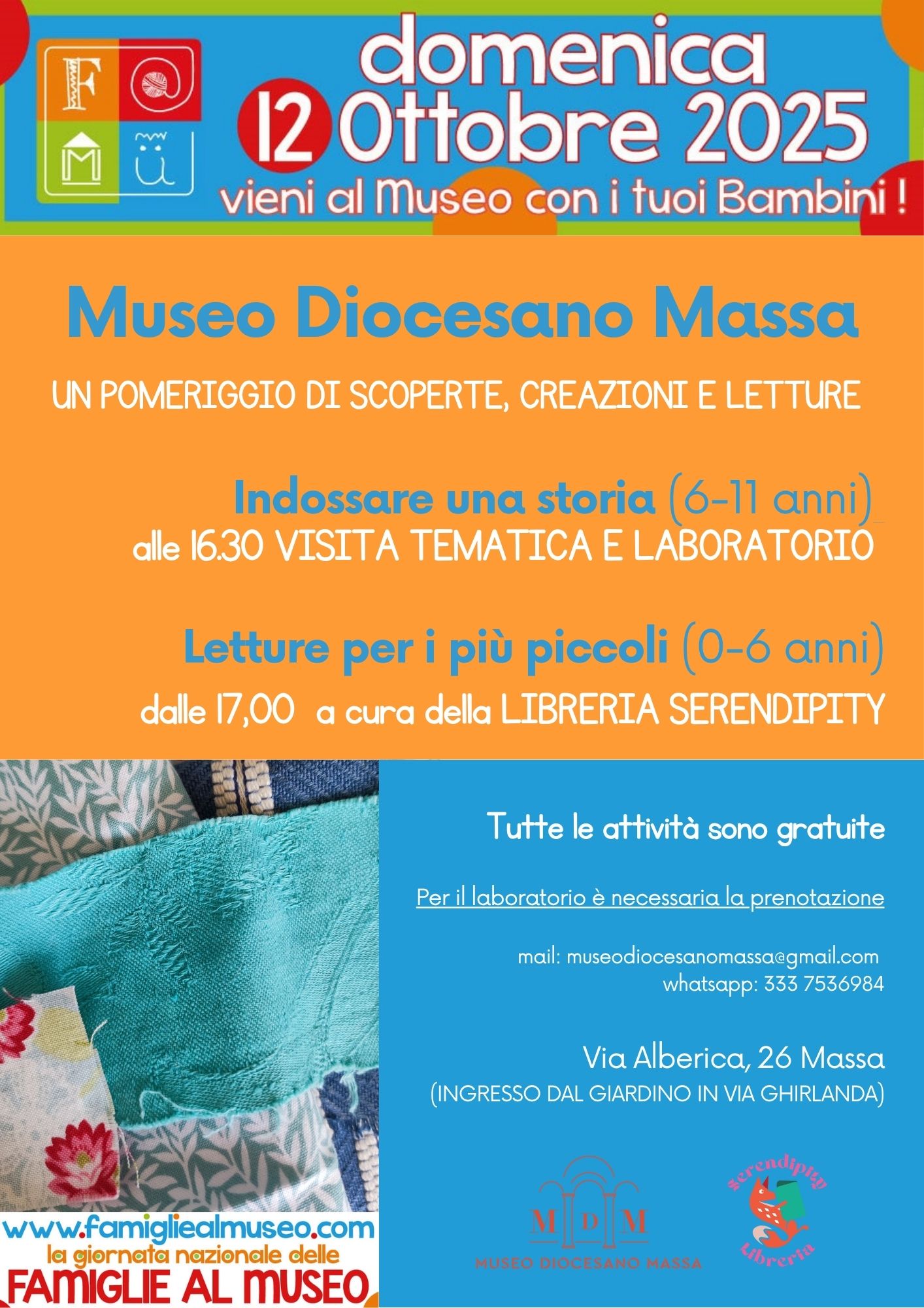 Il Museo Diocesano di Massa partecipa alla Giornata Nazionale delle Famiglie al Museo. I bambini, assieme alle loro famiglie, sono invitati a trascorrere in museo un pomeriggio di scoperta, creatività e condivisione. Le attività proposte saranno due e si svolgeranno in contemporanea così da poter coinvolgere bambini e bambini di tutte le età.